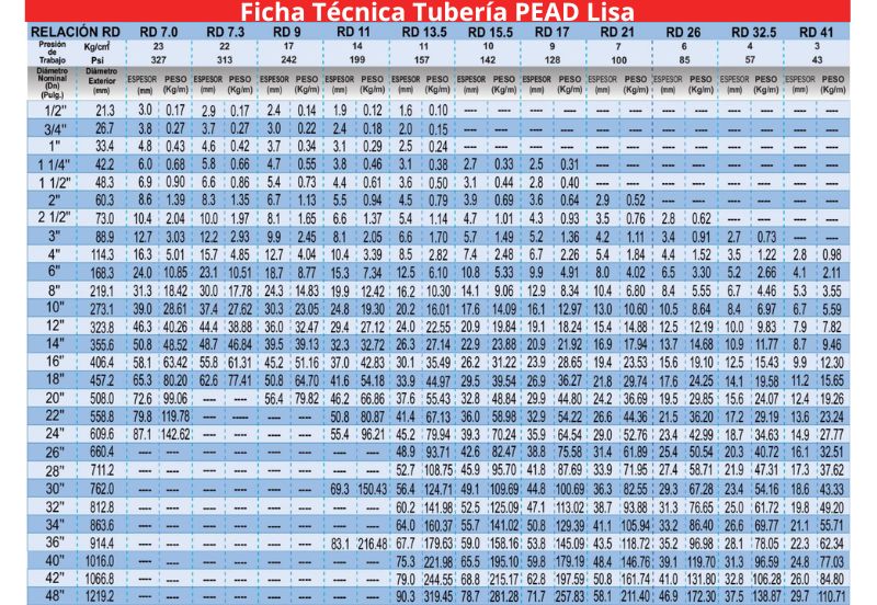 Ficha técnica tubería PEAD: diámetros y especificaciones