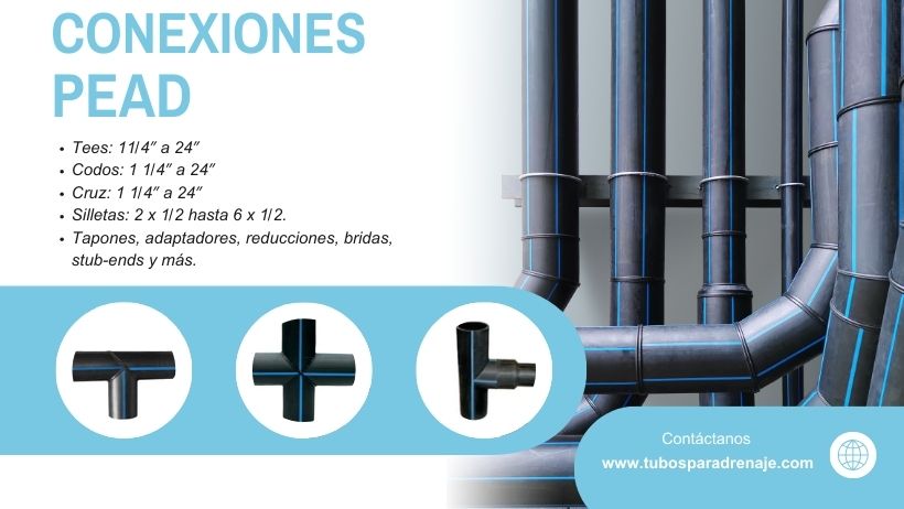 Contamos con conexiones PEAD seccionadas e inyectadas, con superficie interior lisa. Estas conexiones son ideales para complementar la tubería de polietileno para agua potable que distribuimos en México, disponibles en una amplia variedad de diámetros.